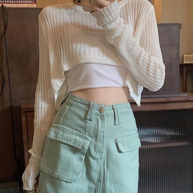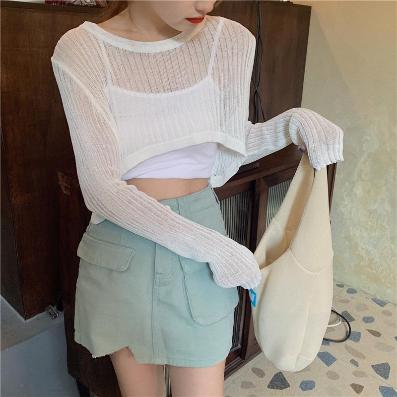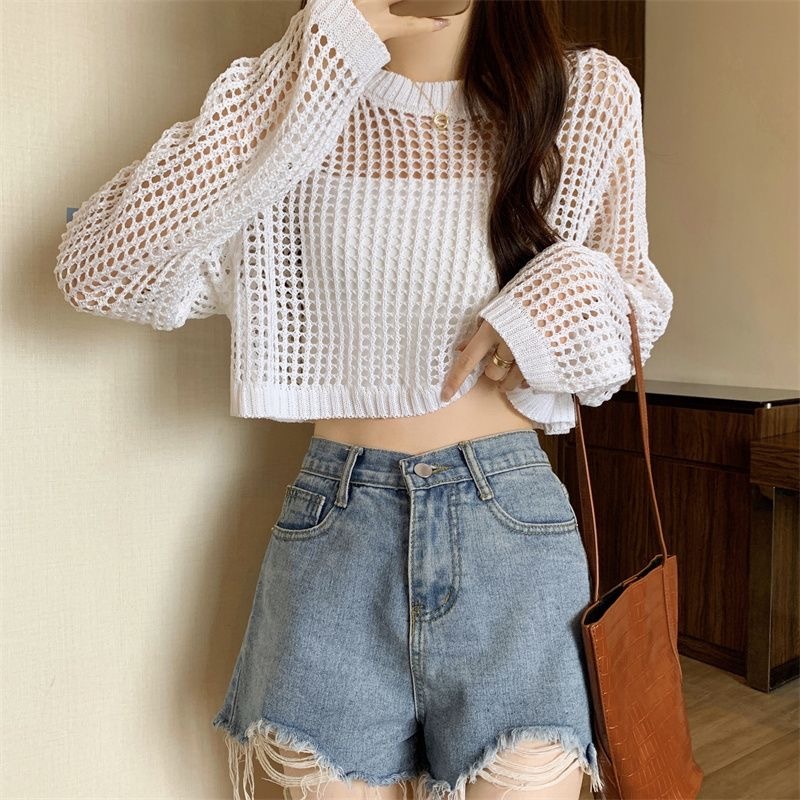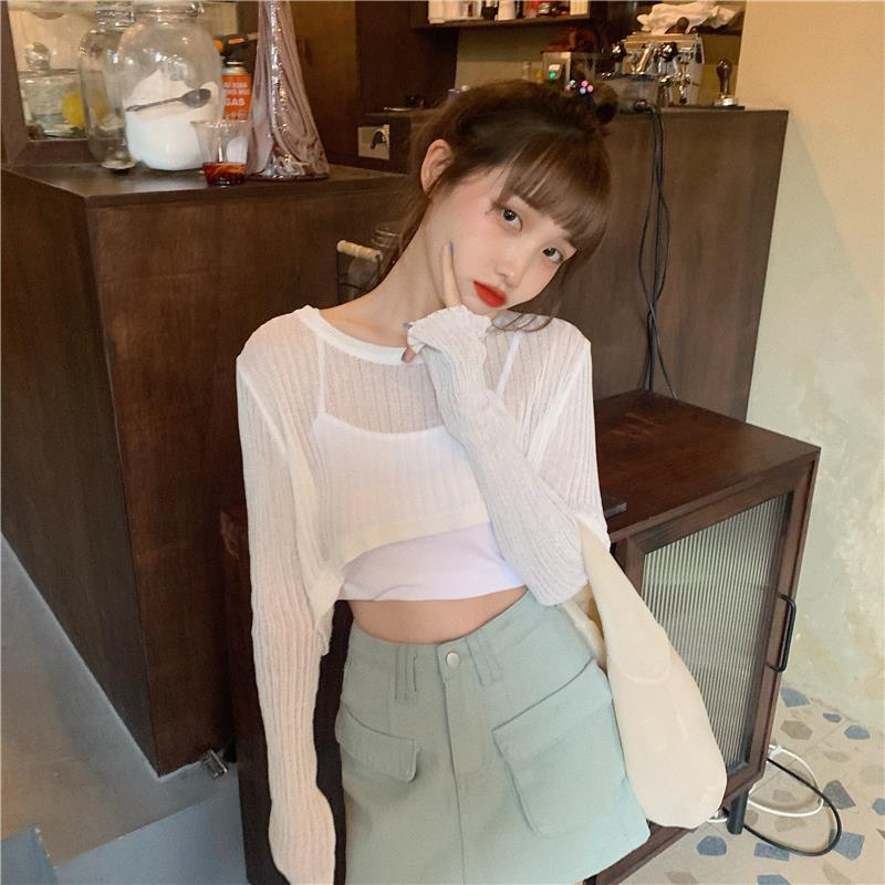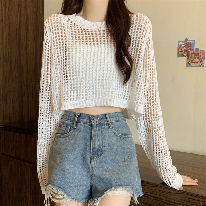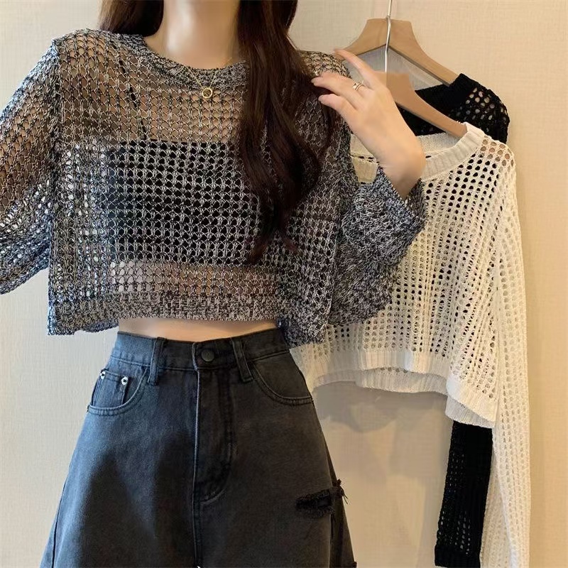 FUXI 鏤空罩衫 長袖針織上衣女 寬鬆外穿短板罩衫 防曬衫 外搭薄款針織衫 女裝 衣服 女生上衣 辣妹上衣白色罩衫(不含背心),均碼 40-60公斤|黑色罩衫(不含背心),均碼 40-60公斤|花灰罩衫(不含背心),均碼 40-60公斤FUXI 服喜行