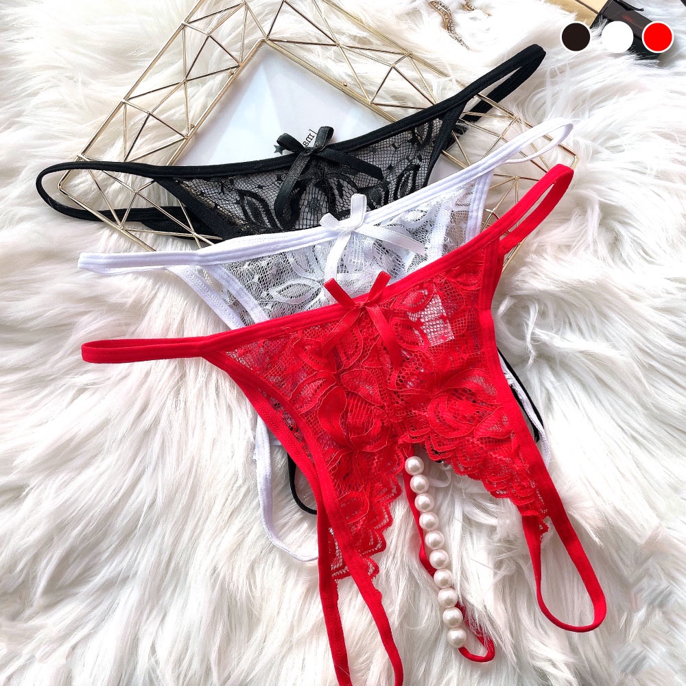 【Mini Queen】赤裸櫻桃 開襠褲 情趣珍珠透膚蕾絲開襠丁字褲 (3色)