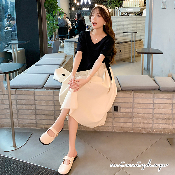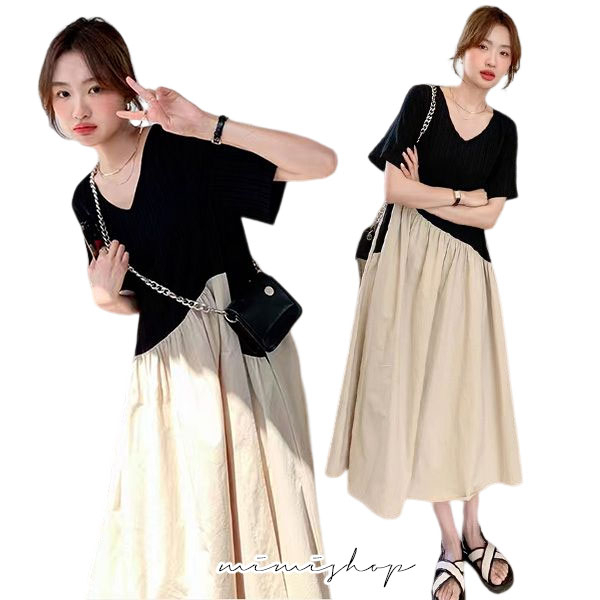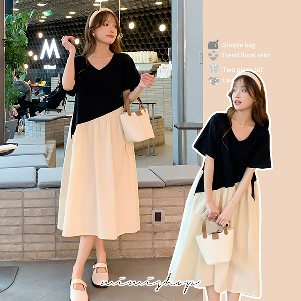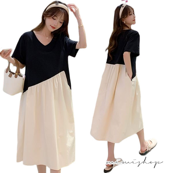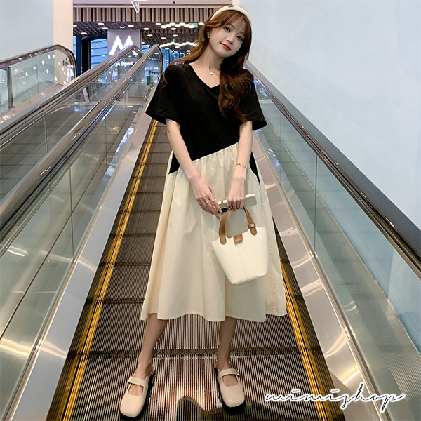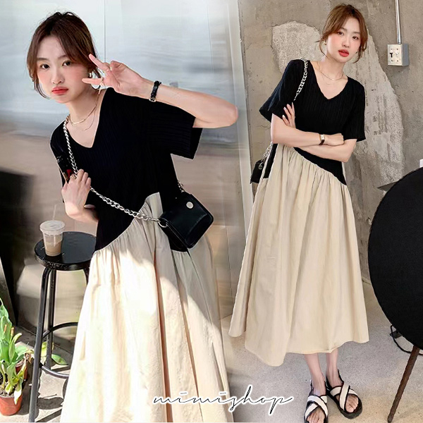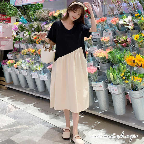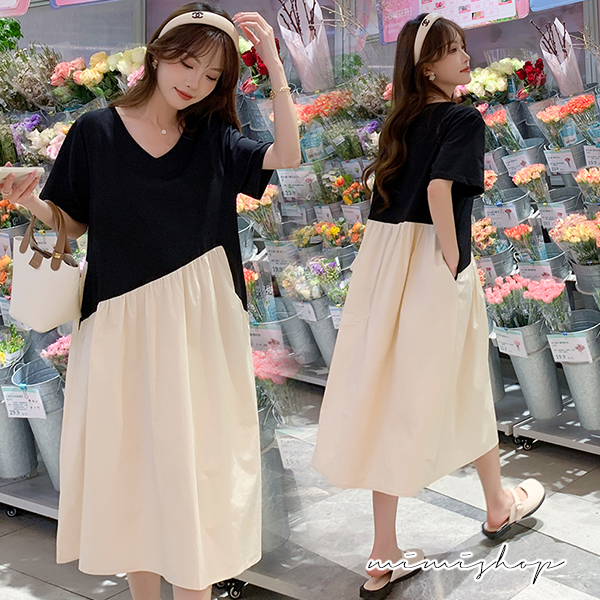 MIMI別走孕婦裝 簡約設計感 不規則拼接連衣裙 孕婦洋裝【P521925】黑拚杏Maternity DressesMIMI別走孕婦裝哺乳衣