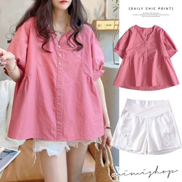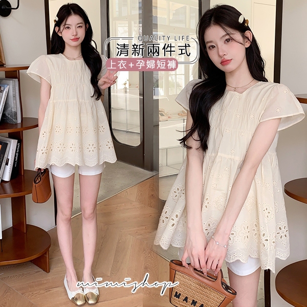 MIMI別走孕婦裝 甜美又顯白 兩件式 鏤空上衣+孕婦短褲 孕婦套裝【P31638】